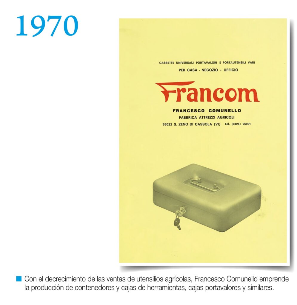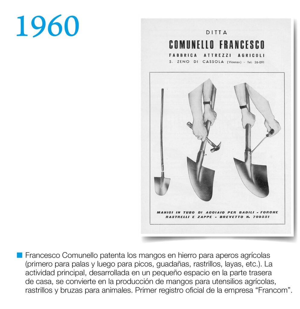 En 2020, Francom Spa cumple 60 años: la empresa celebra este importante aniversario con la publicación de un pequeño volumen en el que recorre las principales etapas de su historia, con palabras, pero sobre todo con imágenes significativas. Desde los años anteriores a 1960, fecha del primer registro con el nombre actual de la actividad de producción de herramientas para la agricultura por parte de Francesco Comunello, hasta 2020. En el medio, muchos eventos que han llevado a la empresa hacia la configuración actual.